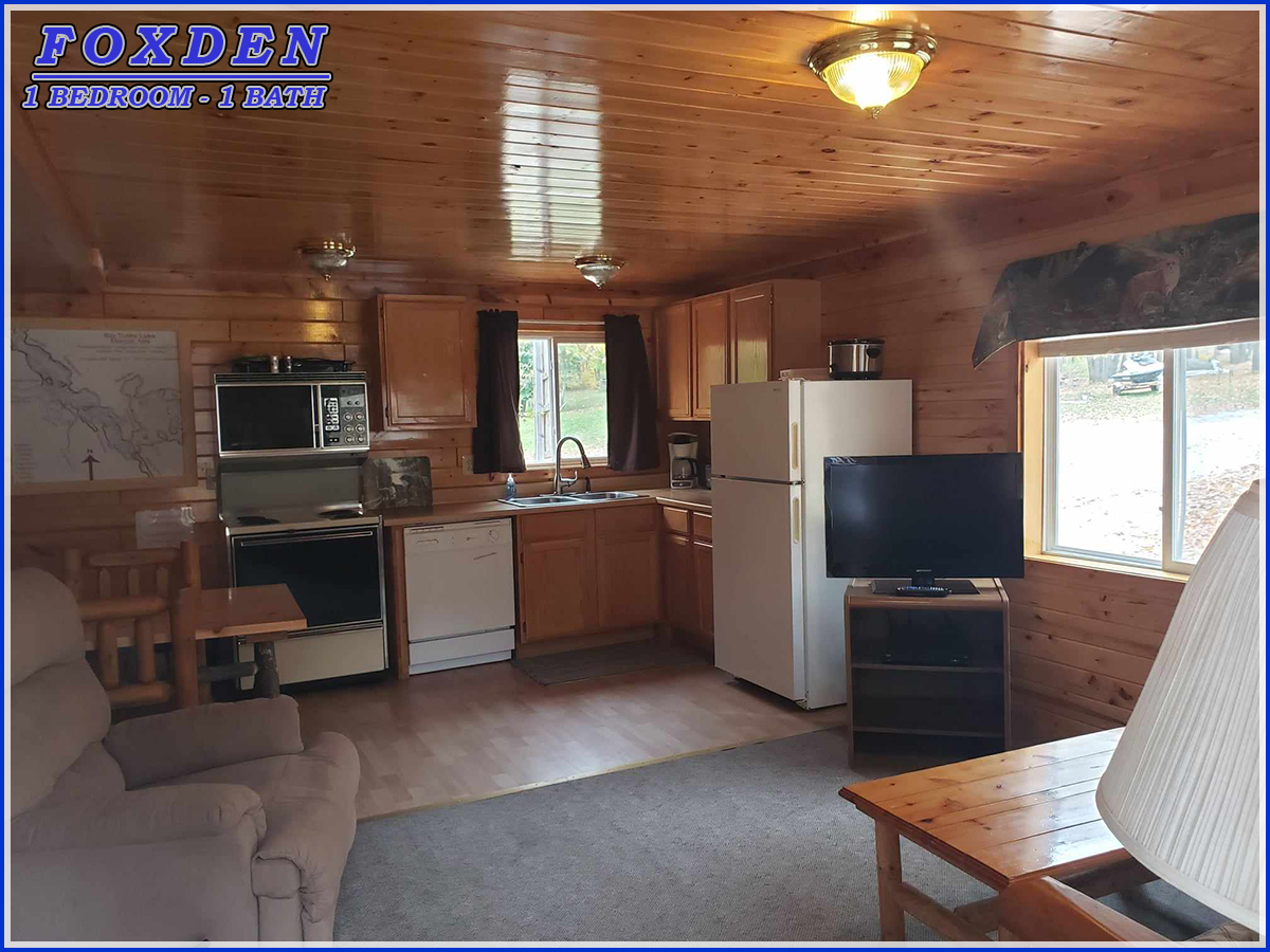 The Foxden cabin is one of our hilltop cabins located between the lodge and beach. This cozy 1 bedroom has 1 Queen room and a futon in the living room. Easily accessable with parking closeby, deck with parital lakeviews. Perfect for couples, young families, and Grandma and Grandpa!